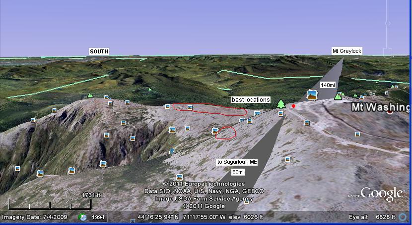2011 Success: Fred, N7FMH was planning the treck, but couldn't make it. So AA1WI, Brian volunteered to change his plans from Sugarloaf to Mt Washington. Best we can tell he had a D710 (because we saw it in a photo). Apparently the RFI and intermod was so high up there, that he was unable to make any maaningful contact on 445.925 coordination frequency. Further compounding the problem was that there was no NewHempshire relay this year. This meant that we had to hope that the link from Grelyock to Mt Washington could be made in one hop. See the RF link to Greylock and the RF link to Katahdin. Anyway, Brian set up MTWASH-13 and was seen at least as far as the GD-hill (non working digi) station and also on KATAHDIN. See his 2011 report.