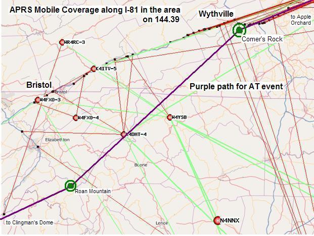 The image above is a plot of APRS mobile coverage on I-81 using 144.39 existing APRS system. In purple you can see the path we hope to use for the AT special event.