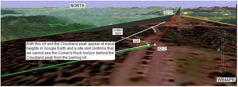 SOUTHERN PARKING LOT: Lee Price reports that the parking lot south of the Cloudland parking lot is higher at the north end near the rest rooms (see view) , but according to Google Earth, that location is precisely blocked in the direction of Comer's Rock by the peak of Cloudland Mountain. From this parking lot location, however, the 320 foot walk to the NW into an open trail in the woods reveals the ideal water tank location noted above.