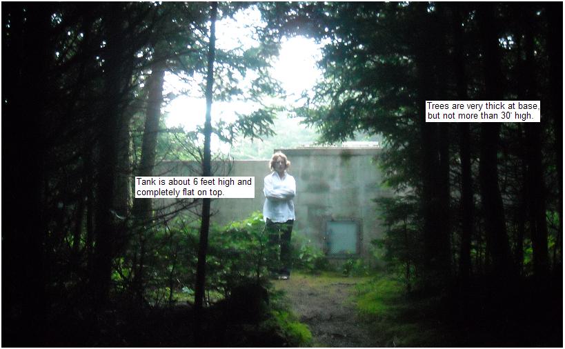 CONCRETE TANK-TOP: This location shown above was found by WB4APR during a site visit in early July and has numerous advantages. It is 320 feet from the parking lot, it has the highest ground elevation, it has clear views in our desired link directions, it has an existing trail to it and it is a great 20'x20' flat working area that is about 6 feet above even ground level and that reduces the mast requirement to less than say 20 feet to clear the trees. Also, it is out-of-sight which is now a requirement since permission to operate at Roan has become problematic due to bureaucratic red-tape. See photos: Tank height, Tank view south, and Tank view north. And finally, here is another more recent view of the tank from Google.