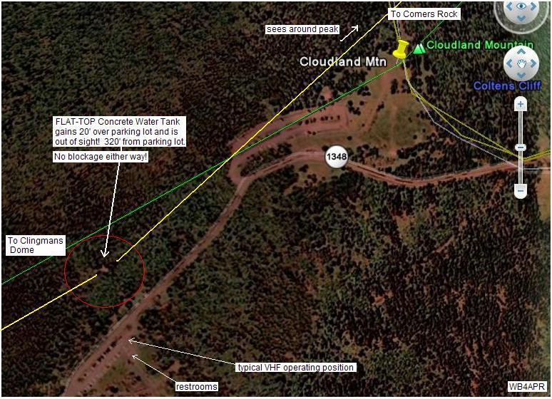 CLOUDLAND PEAK: Google Earth shows the peak of the old Cloudland Mountain (see view) to have about the same elevation as the southern parking lot. But a site visit reveals that the exact NE link to Comer's Rock is blocked by the Cloudland peak from the parking lot. But portable operation from the Cloudland peak does have clear horizon views in both required directions but the horizon is blocked by trees towards Clingman's. See view . The peak here is also about 320 feet from the parking lot. The problem is, it is high visibility and will be easily visible to park personnel.