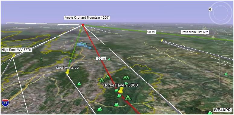 The next two images show the Google Earth views of the RF paths from Roan Mountain to the from the southwest to Sand Mountain and from Sand Mountain to Apple Orchard Mountain..