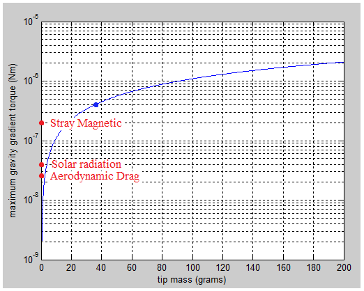 Gravity Gradient: With the full length of the HF dipole wire whips, we hope to maintain a vertical attitude of the spacecraft via Gravity Gradient. Calculations from both Samir Rawashdeh of U-Michigan and Hanspeter Schwab of the Colorado Center of Astrodynamics Research both suggest the plot of restoring torque versus tip mass shown at right. On that, we have indicated our estimates of disturbance torqures. This suggest a 2-to-1 factor tip mass would need to be about 34 grams or the mass of six quarters.