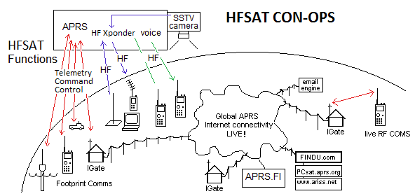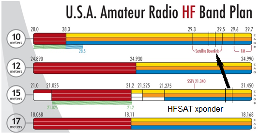 HFSAT Differences: But these prior experiments required users to use the HF for uplink and then to have a completely different downlink on UHF that required high gain UHF antennas and tracking systems. The HFSAT transponder, will both uplink and donwlink in the HF bands so only one radio and only an omni antenna is used.