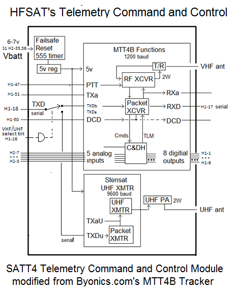 Low Cost Comms Board: Another feature of this cubesat is our development of a standardized cubesat VHF communications card (shown below right) based on the popular Byonics MTT4B all-in-one APRS Tiny-Track4 module for telemetry, command and control. Standardizing the COMMS board makes it easy for us to add the HF Transponder mission into our standard cubesat bus without an all new start. The SATT4 block diagram is linked below. The students are working with Bill, N6GHZ on the HF transponder card.