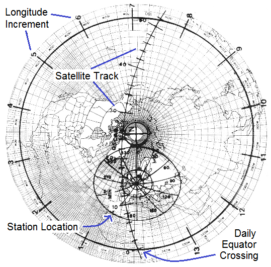 Back in the 1960's at the start of the Amateur Satellite Service, no one had computers and all satellite predicitons were based on simple paper prediction devices such as the OSCARLOCATOR shown here. A polar map of the world had two plastic overlays. one was an overlay of azimuth and elevation angles centerd on the ground users's location, and the other was an overlay of the orbit track. All that was necessary to predict the satellites pass times was the equator crossing time and longitude. Rotatin the ground track overlay pointer to that longitude equator crossing would then be able to show an entire day's worth of passes.