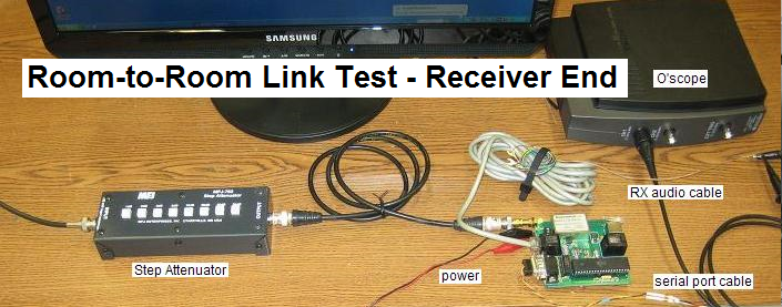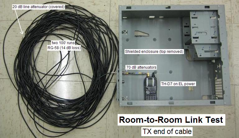 attenuators in the middle. Then the cable connects to a step attenuator at the receiver for making weak signal link tests. The huge physical separation makes sure there is no leakage around all the attenuators.