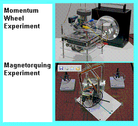 ATTITUDE CONTROL LABS: In addition to the momentum wheel and magnetorquing coils shown above, the attitude control lab also uses thrusters. The initial approach shown above uses match-head thrusters, but having a room full of students and boxes of matches is a bad mix. . The next thruster design used Estes rockets shown below, but during the third year, it flew off the support string and crashed and burned. . The 2008 version is an excellent final design that uses small CPU fans as thrusters.