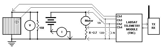 The drawing below shows how the LABsat telemetry system is typically used as a data collection device during experiments. In this case the 4 of the channels are being used to collect Solar Panel voltage and temperature, plus current and battery voltage and discharge current of the torque motor.
