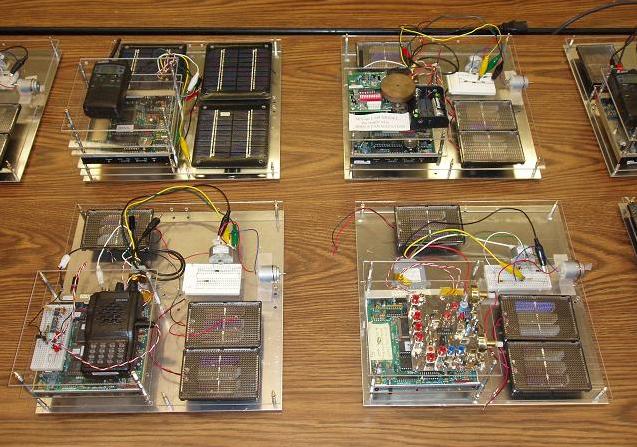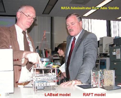 LABsats: These labsats shown here were used from about 2004-2010 and were based on a Kantronics TNC plus various innexpensive amateur radio hardware and sensors to give students in the US Naval Academy's Aerospace labs various hands-on experiments with satellite technology at low cost. The photo above shows deputy NASA Administrator Admiral Steidle being briefed on the LABsat system. We use the LABsats to support about 33 lab periods covering a number of space design principles in our sophomore intro labs (EA204) and in our senior spacecraft design labs (EA467).