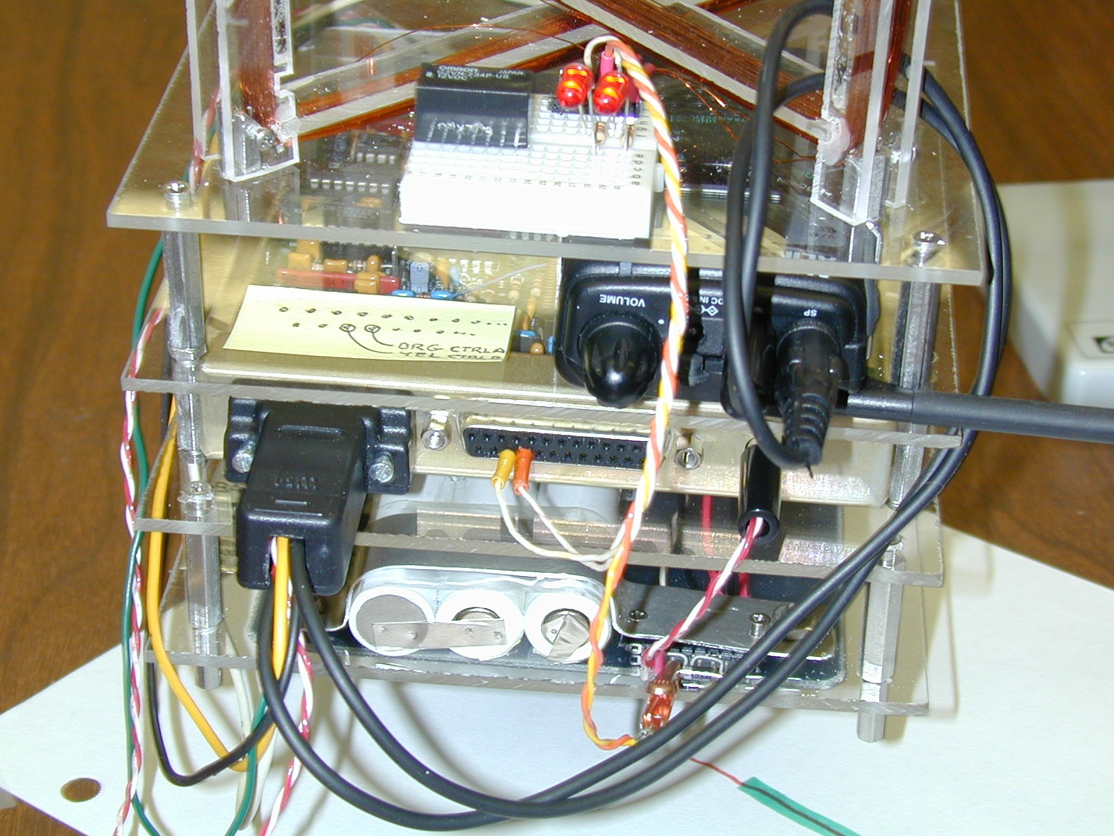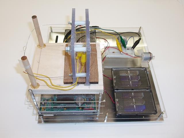 STACK INTEGRATION: The next close up view of the magnetorquing experiment shows how the standard 6"x6" modules stack up to compose a LABsat. By having a common footprint, the students have greater freedom in the physical layout of their designs. In the attitude control lab, they have to arrange for a good center of gravity and calculate their moment of inertia. This view, from top down is composed of:
