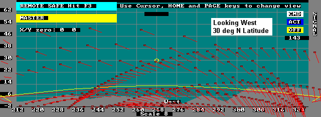 SATELLITE TRACKING: The USNA Satellite Lab maintains a track on all of our own satellites plus other university and interesting satellites. When passes occur during labs, students participate in ground station operations. In a number of experiments, the students have done the planning and scheduling of PCSAT2 and PCSAT1 commanding. (PCSAT2 Ops Lab), (Joint ops Planning Lab). The image below is used to help the students visualize the daily pass geometry of PCSAT2 over our station.