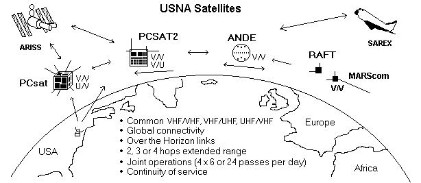 USNA SATELLITES: A total of eight independent Telemetry Command and Control Systems similar to our labsats have flown or have been delivered for flight as shown below. Both PCsat, PCSAT2 and ANDE are dual systems, meaning they carry two complete systems each. The dual systems give redundancy, and also give multiple functionality. The RAFT and MARScom systems have single TC&C systems.