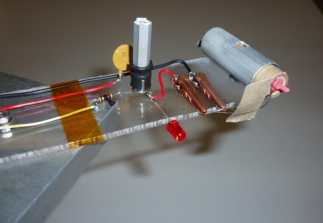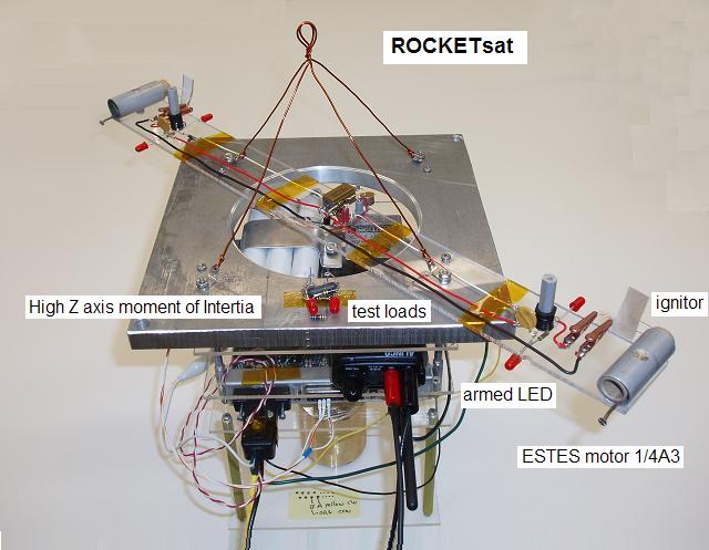In 2006 we abandoned the match-motor tiny thrusters for a much more vigorous ESTES rocket motor on an actual LABsat as shown above. This satellite was hung outdoors but close to the lab window so it is easy to see. First the CW motor was fired to give the satellite a good spin. Then the CCW motor was fired and if they were close in performance, then the second motor would counteract the spin and return the satellite to rest in about 1 second. . With lots of smoke and fire of course.