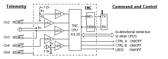 TELEMETRY: The block diagram of the Telemetry Command and control interface is shown below. The bidirectional serial bus allows unlimited expansion to other processors and experiments. This TC&C module is used as the foundation of most of the labsat experiments. It is identical to the 8 currently flown or manefest on USNA satellites.