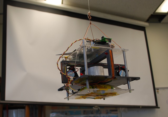 ATTITUDE CONTROL LABS: The below images were our labsats in about 2005 showing the reaction wheel and torque coil labs. The initial approach shown above right used match-head thrusters, but having a room full of students and boxes of matches is a bad mix. The next thruster design used Estes two rocket engines on outriggers on a very massive plate (the large mass to keep it under control). But during the third year, the labsat flew off the support string and crashed and burned. . The newer LABSAT we developed in 2008 and still use is an excellent final design that uses small CPU fans as thrusters.