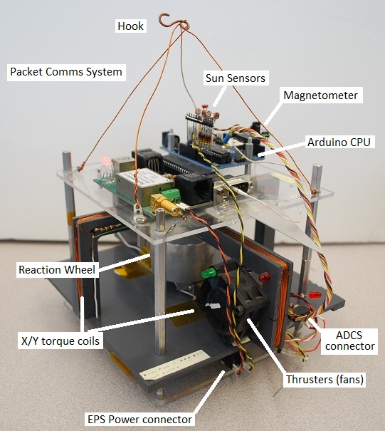 By the end of the semester the 33 labs have then learned everything from power system to comms, sensors to control, and ending in 4 labs on Attitude Dynamics & Control (ADCS) where the labsat is hung on a string where it can be commanded and controlled by the Arduino. A final demo deploys the satellites on strings around thee campus with their S-band cameras so the students can command the Spysats remotely using the ADCS modes.