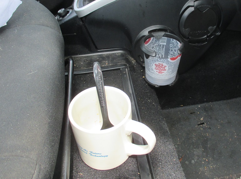 So today, I realized the simple fix. Take a large plastic drink cup that fills the cup holder, rinse and then