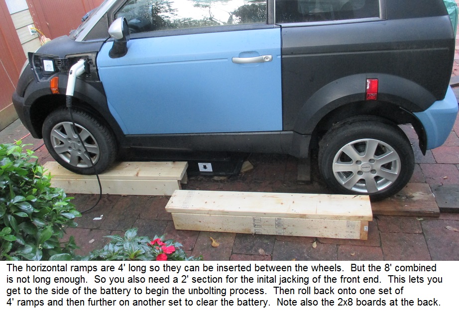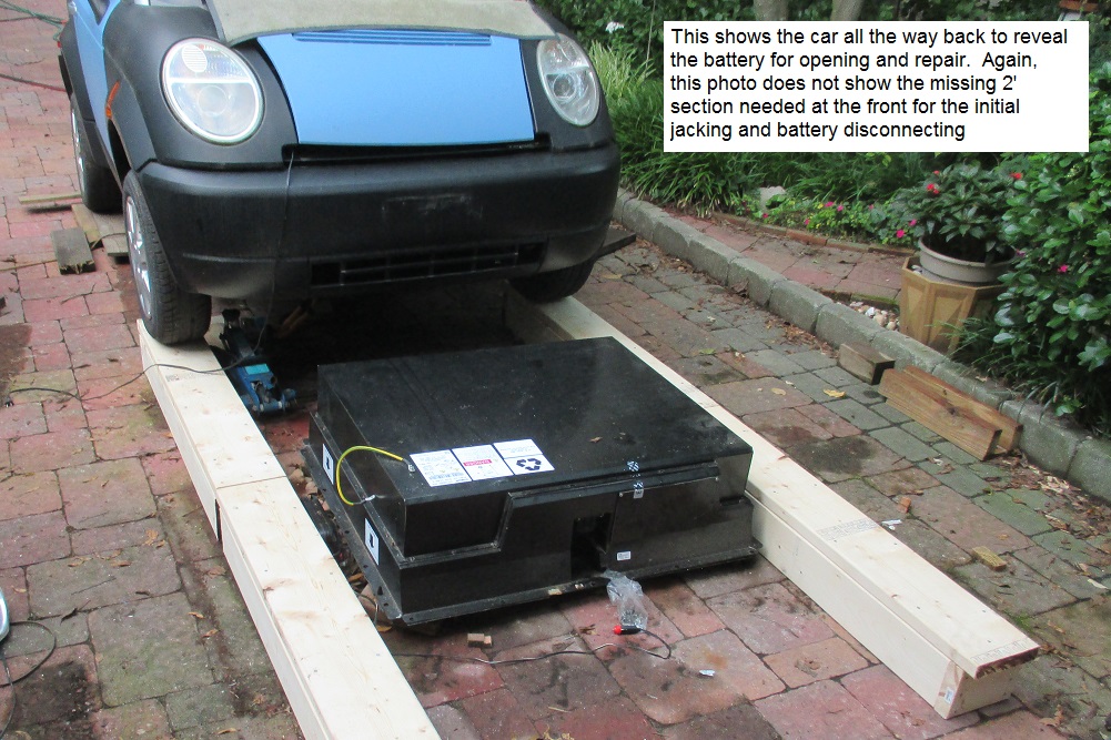 The above photo shows the lifted car moved back on the ramps to clear the battery for repair. But, come to