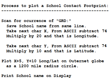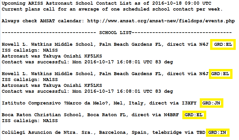and parse out the LAT/LONG of the upcoming school contacts from the listed Grid Square indicated as GRD:XY in the file above. These