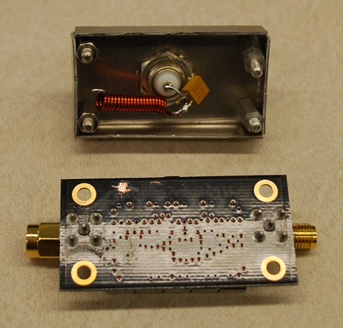 My attempts to modify my setup: Of the above tasks, about the only thing I can do is antennas. So here are some photos of my attempts to rig something up. First, I added a series tuned resonant circuit to couple the 2 meter whip to the coax connector on the output of the LNA. The idea was that the SDR can hear the VHF signal there. The photo on the far right then shows the assembled L-band LNA with the added 2m whip antenna.