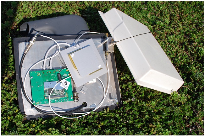 The next photo then shows the oudoor Outernet Patch antenna and LNA with the modified 2m whip. The green electronics board has nothing to do with this project. It is just something already inside this plastic radome cover.