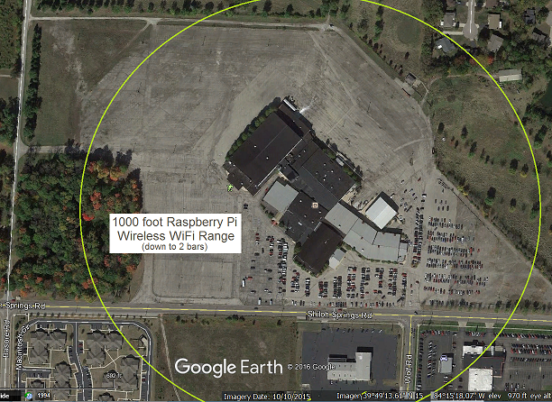 Shown at right is a typical oudoor enclosed Outernet Raspberry Pi HotSpot and then the oudoor range overlayed on the familiar Hara Arena in Dayton Ohio. This was the site of the annual pilgramige of about 20,000 hams to the Hamvention. It shows that outernet files served from the PI could be available to all participants if the node was raised high enough to clear the building in all directions. This is the 1000' circle of a Raspberry Pi after a full size WiFi dipole is added to the board as described below.