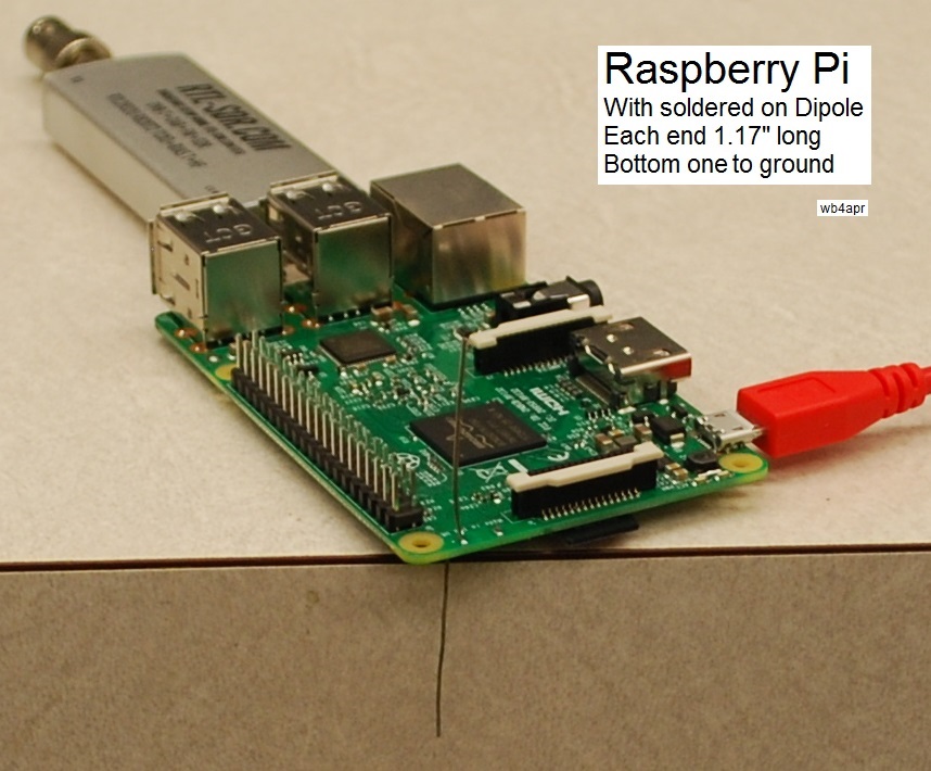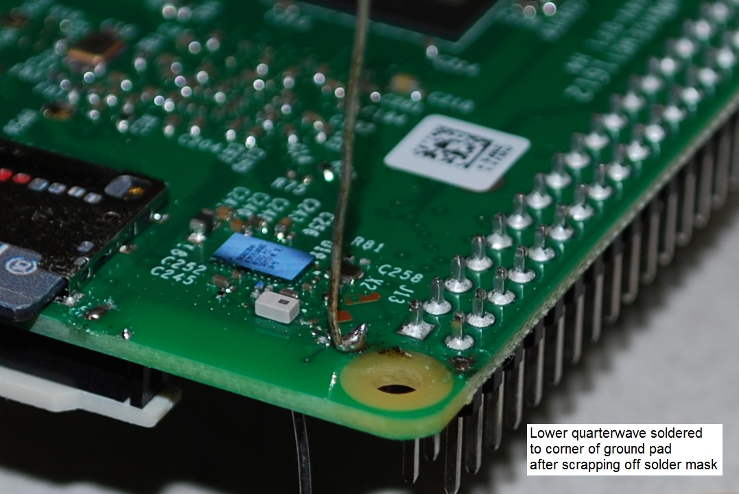 Modifying the PI antenna: The next two images below show the Raspberry Pi with the wire whips installed. The top half of the dipole is clearly the driven 1/4 wave monopole. The other side of the dipole is just soldered to the corner of the groundplane on the bottom of the board. The lengths of the wires are 1.17" for resonance (assumed) at 2.4 GHz.