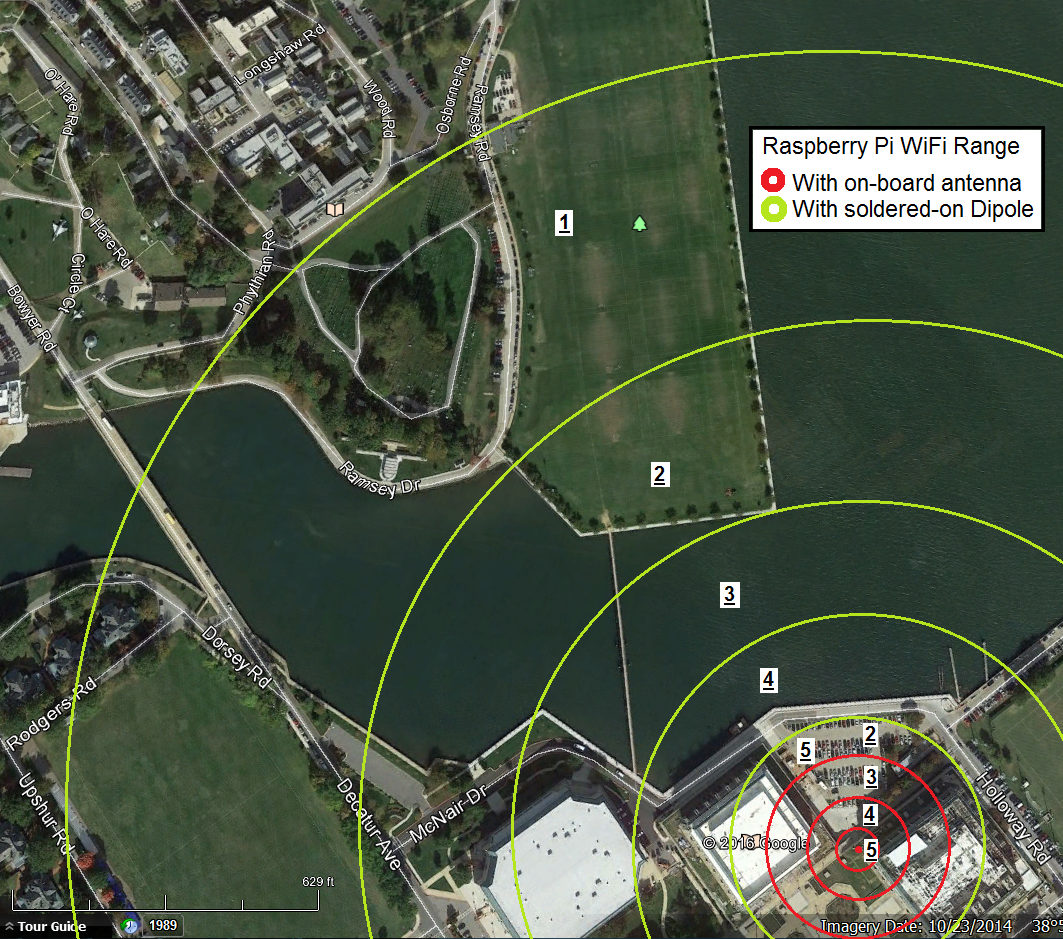 Actual Range Test: To get the size of the circle, I set my PI outdoors and walked around the Naval Academy with my laptop to watch the bars on the WiFi display as shown below. The red circles show the disappointing range of the PI using its installed chip antenna on the board. When I removed the chip antenna and soldered full size 1/4 wave wire whips to make a full size WiFi dipole, the range inproved to the approximate 1000' radius (for 2 bars) as shown with green. This was a subjective test and I was holding the laptop in its most favorable WiFi direction. It is unknown how this scales to the WiFi in a typical phone, for example.