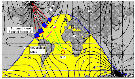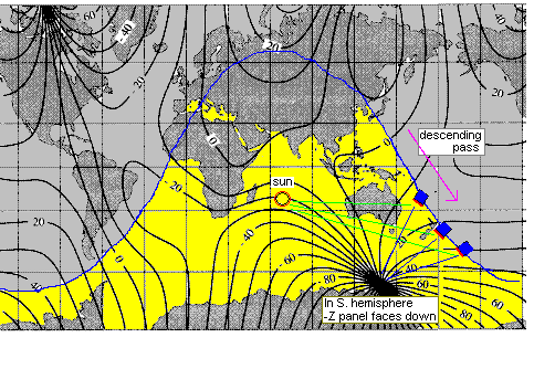 Importance of Magnetic Field and Latitude: The plots below show the impact of the -Z panel facing the south pole. The magnetic field lines have an impact as much as 40 degrees East and West on the attitude. (and almost 180 degrees on up/down attitude not shown here). So the East/West offsets are to our advantage during ascending passes on the East coast and descending passses over the West coast and NewZealand. The +Z panel faces UP away from Earth in the Northern Hemisphere and down towards Earth in the Southern hemisphere. The blue line is both the ground-track of PCSAT and also the DAY/NIGHT terminator and is the only time we can recover PCSAT becuse it is in full sun throughout the orbit for about one week..
