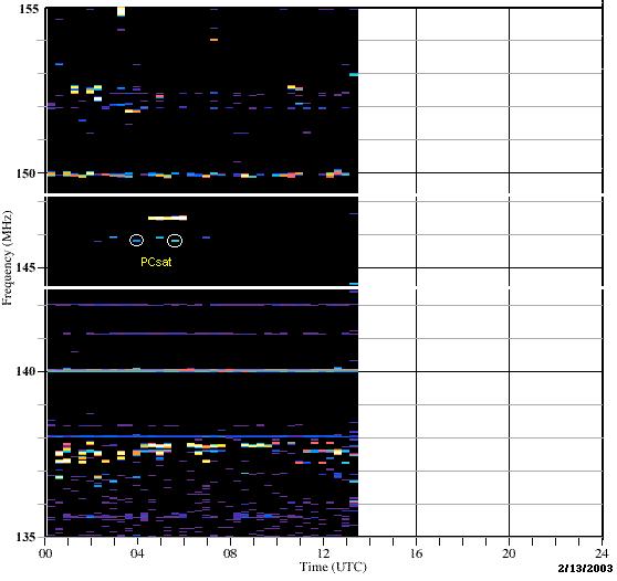 HARP DETECTION:ex-N5JXU alerted us to the WEB page for the HARP radar in Alaska. It captured PCSAT as shown at right. This chart is a waterfall plot of the readings taken by the HARP Monitor. Spectrum samples are taken at 20 minute intervals throughout the day. The color indicates intensity, from deep blue to red.