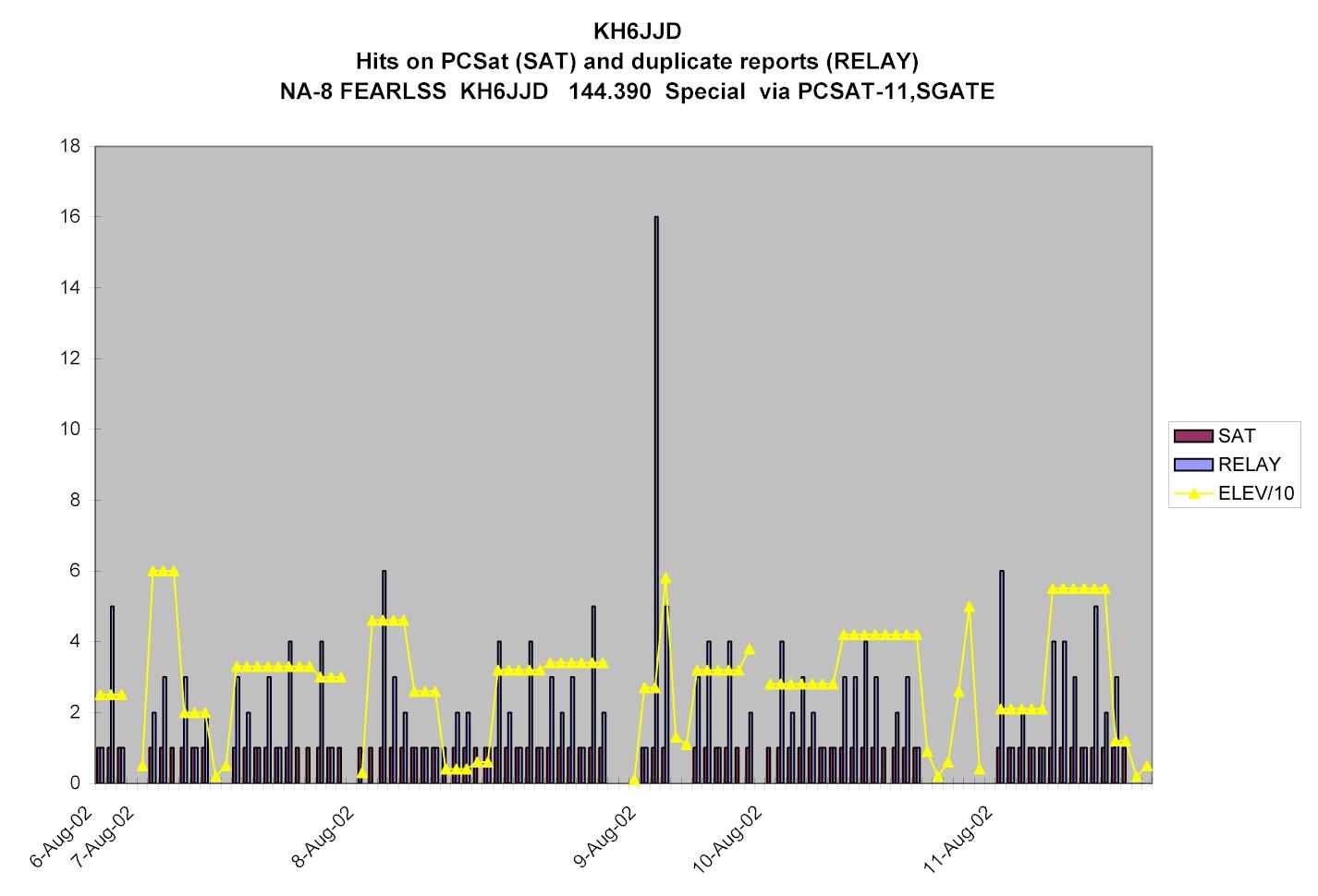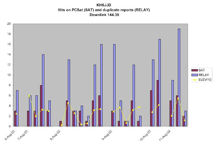 SUMMER SUMMARY: Between 6 to 16 August, PCsat returned to normal ops (Day and night) as eclipse periods dropped from the usual 35% down to 30% thus improving the power budget into positive range for about a week. We conducted comms experiments with four of our sailboats on summer cruise and tracked them automatically on almost every pass. Ted Rogers KH6JJD made this summary and this detail plot of his satellite successes from his boat. On 16 Aug, PCsat returned to DAYLIGHT only operations.