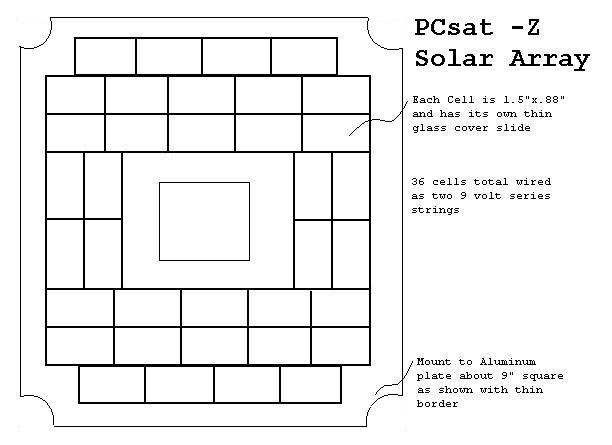 PCSAT SOLAR PANELS: PCSAT pioneered the use of innexpensive Tedlar coated solar panels in space for low cost short duration missions. These panels are off the shelf and cost less than 1% of the cost of normal space rated panels, yet they provide about 50% of the performance and life. About half way down this page you can see how we used 4 of these $30 panels for each side of PCSAT. Or you can see how we built our first 5" cubesat using one panel per side. See photo.