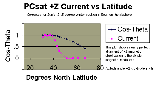 Magnetic Stabalization: See plot of +Z current versus latitude that confirms our passive magnetic attitude alignment.