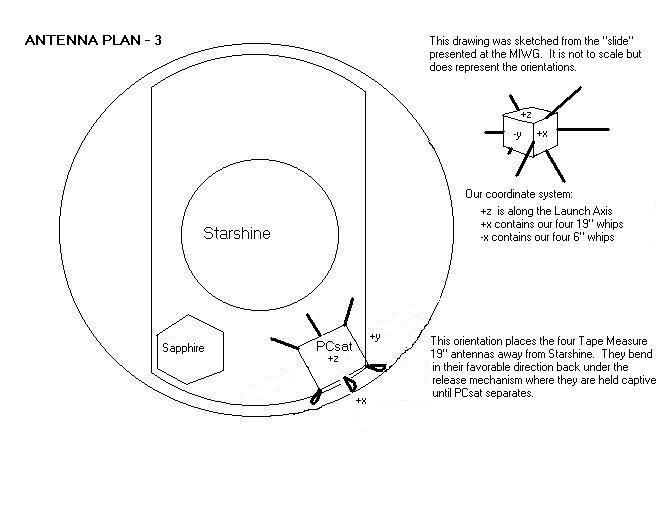 PCsat was an auxilliary payload on the Kodiak Star mission which has a total of 3 amateur satellites on board. The Sapphire satellite is also a Naval Academy mission in a joint venture with Washington University. Starshine is the primary NASA payload and it also uses APRS style telemetry packets. The following frequencies are used: