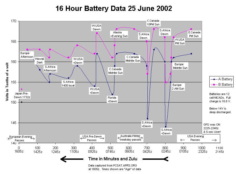 From 10 May to 8 June, PCsat was in maximum eclipse cycle and we had to turn off the digi. When we do this, the callsign changes to NODIGI as a means of alterting USERS to this situation. PCsat is now in its fourth such low power period where it experiences over 380 deep cycles on its batteries... See 6 Mar-10 Apr report, and recovery! During these periods we depend on the dedicated efforts of G6LVB, IT9GSV, LU7ABF, LW2DTZ, VK3JT, WB4APR, ZL1AOX, ZR1FN, ZR1CBC, VK2XGJ, to keep us in the best power situation...