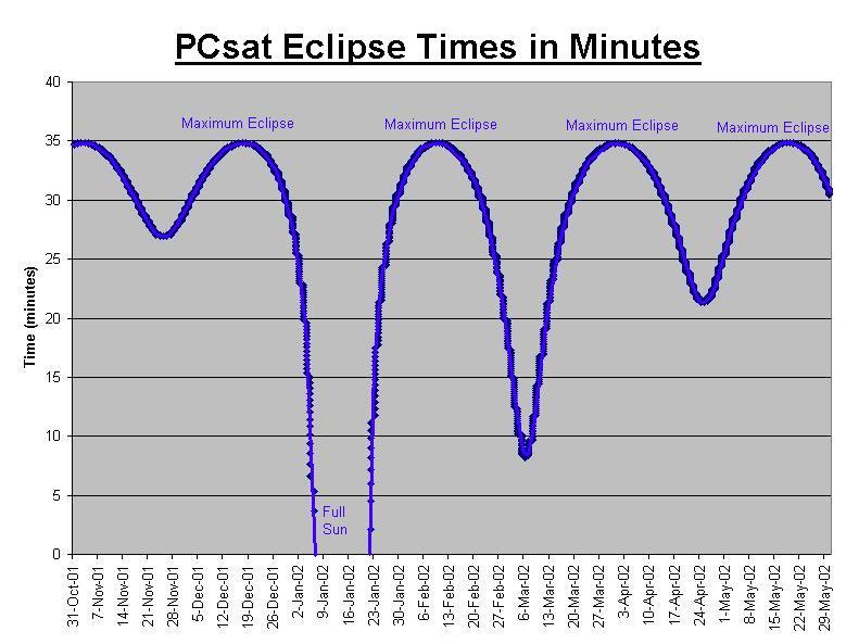 RECENT ACTIVITY: PCsat was in full Sun 20-29 Sept, and supported full GPS operations then. PCsat also completed its one-year anniversary at 0240z on 30 Sept 2002. See note. On 2 October, eclipses were up to 27 minutes long, but PCsat was still holding its command set without a reset. But as soon as we get a reset, PCsat will be back to SUNSHINE only operations as she continues to deep cycle her Nicads on every orbit to eventual failure.