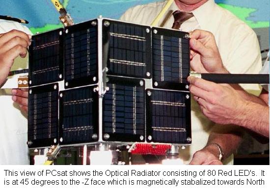 PCsat, a Prototype Communications Satellite, is a US Naval Academy Aerospace student project designed to give students real hands on experience in satellite design and operations. This web page is frequently updated with current information about the Satellite operations. New information is added at the top of the page. Go further down to get the original background information if this is your first visit.