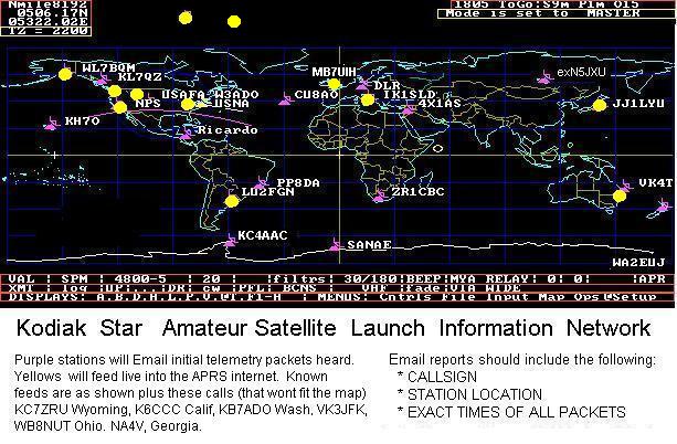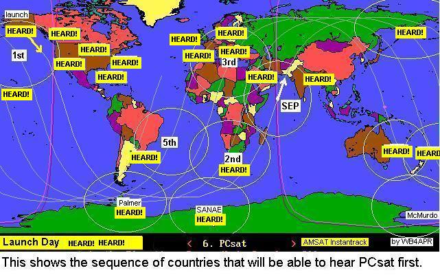 The following graphic shows the first 4 orbits starting at separation off the coast of Somalia 70 minutes after launch. The graphic shows what populations of amateur satellite operators first heard signals. As of 0600Z we had heard of confirmations from our Launch Information Network of key stations. (See MAP). Early Reports then came in from Alaska, Hawaii, the SANAE station in Antarctica), and South Africa and in the next 12 hours from everyone around the world.
