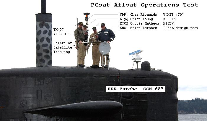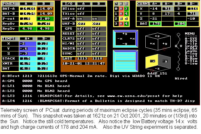 FALL 2006 OPERATING WINDOW: From 26 Sept to 11 Oct 2006, PCSAT-1 was fully operational in full Southern Sun. When recovered, she operates as PCSAT-1 and supports the aliases of APRSAT, ARISS and WIDEn-N. If you see the default W3ADO-1 callsign then she is running down every orbit in the dark and does not have enough energy for most packets. This call should not be used for digipeating!