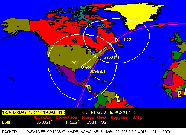 FALL 2005, OPS NORMAL 25 Nov to 17 Dec 2005:: During this full sun operating period, we switched PCSAT2 to the 145.825 frequency for joint dual-satellite operations with PCSAT-1. The image at right shows the double hop telemetry packet we received from PCSAT2 via PCSAT-1 and you can see the later 12/05 pass too.