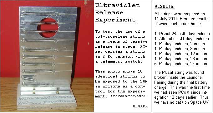 User Services: PCsat was activated for users as of 1930z on 3 Oct and demonstrated (photos) at the 2001 AMSAT Symposium in Atlanta, GA on 5 Oct. Note that due to frequent resets to SAFE mode on orbit which causes PCsat to revert to its pre-launch callsign of W3ADO-1. This call should not be used for digipeatging! Users should read and affirm the PCsat User Service Agreement.