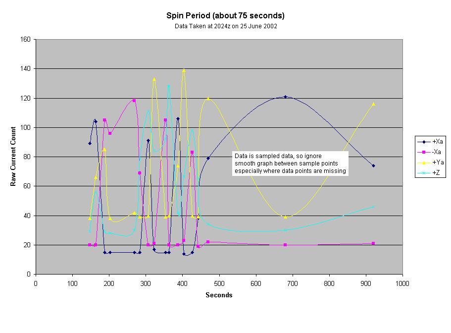 Operations 2014: Wow, 6 years since last time we commanded or at least updated the web page! But PCSAT continues to operate every day now for 13 years. Though we seem to no longer be able to recover it from reset mode. You can see its live downlink. On 3 April 2014 we logged on and recorded 4 minutes of solar panel data and plotted the Z axis solar currents and determined that she is spinning at one revolution per 100 seconds or 0.6 RPM the same as it was 12 years ago. So the passive black/white differential solar radiative pressure spin system is still working fine. You can see the black/white equitorial antennas here.