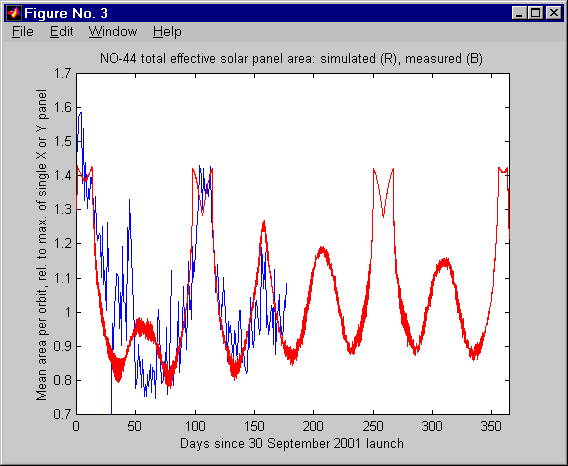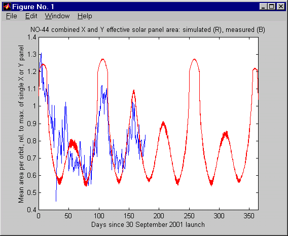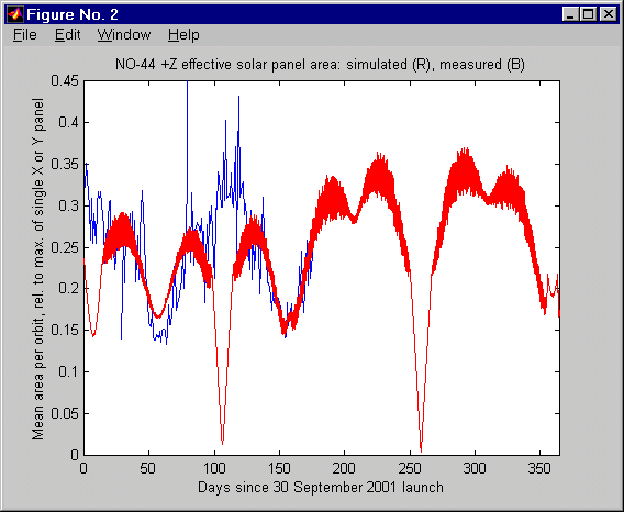 PCsat is magnetically stabilized about its Z axis so the orientation of the +/- Z panels is according to the Earths Magnetic Field vector at each point in space. We have been working with Johann Lochner, ZR1CBC of the SUNSAT Team, who has developed a model of PCsat's orbit with respect to the Earths Field so that the total effects of Solar incidence angles can be predicted. These graphics compare our actual telemetry data to his orbital model.