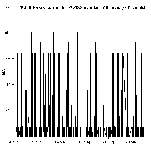 PSK-31 Transponder was enabled for the first 4 weeks. Initially, uplink signals as low as 4 watts on 10m resulted in excellent downlink signals. But degradation over the last 2 week period required 100W or more to be heard. Due to weak signals the transponder has been turned off. See PC2PSK Transponder control method and RX current since launch and some operating notes for the PSK-31 transponder.