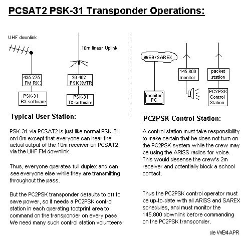 PCSAT2 CAPABILITIES: PCSAT2 is attached to the ISS and brings to ARISS new capabilities such as the PSK-31 transponder (see OPS plan),(now inop), a digipeater and an FM voice transponder. These operations must be in cooperation with the ARISS communications suite to minimize any mutual interference and to coordinate activities. All users are welcome who operate in accordance with the PCSAT2 User Service Agreement. Here are the capabilities of the PCSAT2 and ARISS payloads: