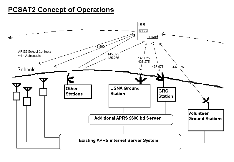 PCSAT2 ORIGINAL PROPOSED OPERATIONS PLAN: Unfortunately, the PCSAT2 design freeze was Dec 2002 for a July 2003 Launch. At that time, there was no cross-band capability on ARISS and so PCSAT2 had to be designed with a UHF downlink and VHF uplink to avoid any interference to monoband 2 meter ARISS school contacts. The Kenwood D700 was not to arrive until 2004. Unfortunately, due to the 2 year shuttle delays, the Kenwood with its crossband capabilities arrived before PCSAT2. But because PCSAT2 was designed to be compatible with monoband ARISS operations, we cannot fully use the intended crossband ARISS modes until after the one year PCSAT2 mission. So during this overlap year, the following combination was proposed as the best overall compromise with continuation of the status-quo and minimizing interference:
