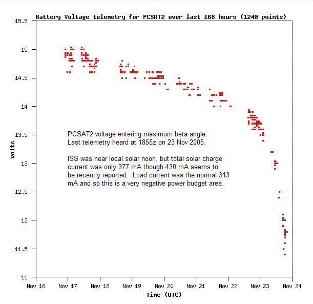 Dec 2005: PCSAT2 awoke on 1 Dec from its 23 Nov low-power shut-down state when ISS changed to XPOP (Xaxis Perpendicular to Orbit Plane) attitude that oriented PCSAT2 towards the Sun again. Shut down had occurred at 11.4v out of its nominal 16v system during this worst Sun angle since launch. See plots of the voltage plunge and last telemetry. on 2 Dec, PCSAT2 was changed to a VHF downlink to operate as a constellation with PCSAT-1.