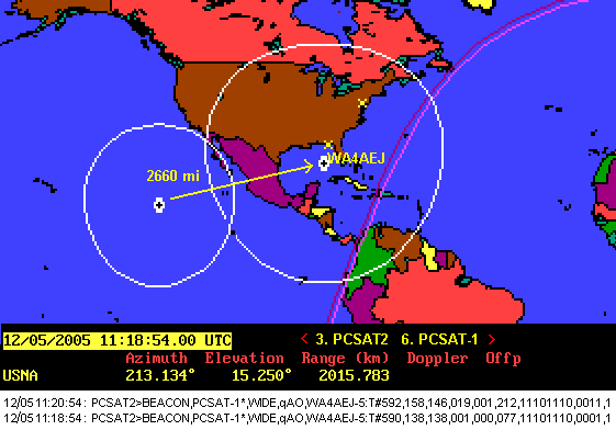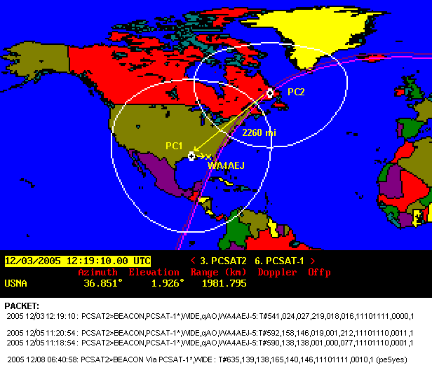 DUAL-HOP CONSTELLATION EXPERIMENT: On 2 Dec 2005 (and again on 10 March 2006), PCSAT-1 was available for 2 weeks of full Sun and for joint operations on 145.825 until 17 Dec when PCSAT-1 went back to hybernation. See details. The view below shows the path of a PC2 telemetry packet through PCSAT-1 and then down to a SATgate in Florida.