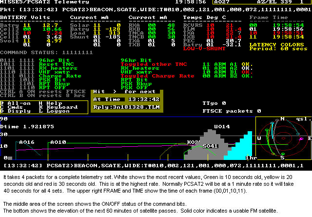 9600 Baud Telemetry Data: The 9600 baud data uses a modified version of the globally connected APRS internet system, since the data is not of immediate interest to the existing APRS network servers. Phil Pacier AD6NH helped set up this server written by Pete, AE5PL for this purpose. Volunteer groundstations around the world use their IGate software to logon to this site and feed live telemetry. This system is compatible with all APRS normal routing methods. The PCSAT2 Solar Cell data is in an experimental APRS data format (See Solar Cell Telemetry Data). Principal sites use Bill Diaz's ALOGGER software (see above).